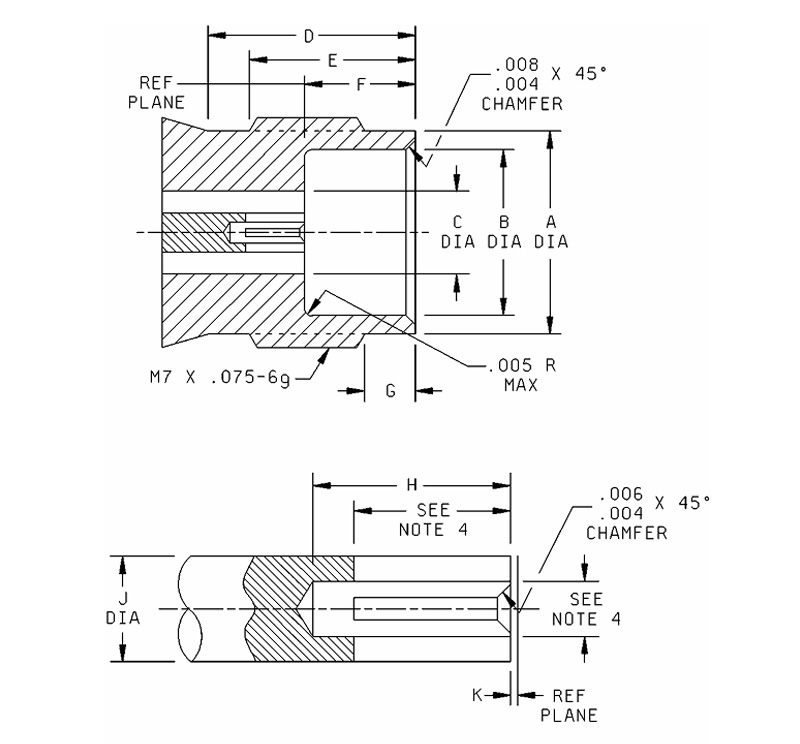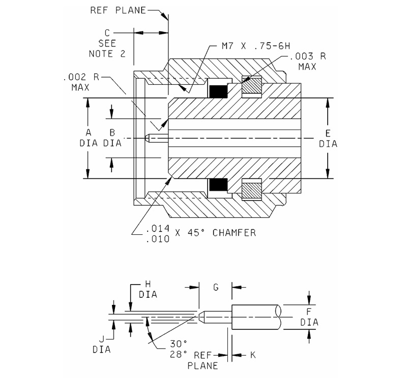 1. 나사산 길이는 커플링 너트 끝에서부터 최소 4.37mm(.172인치), 0.63mm(.025인치)±0.25mm(.010인치)입니다.